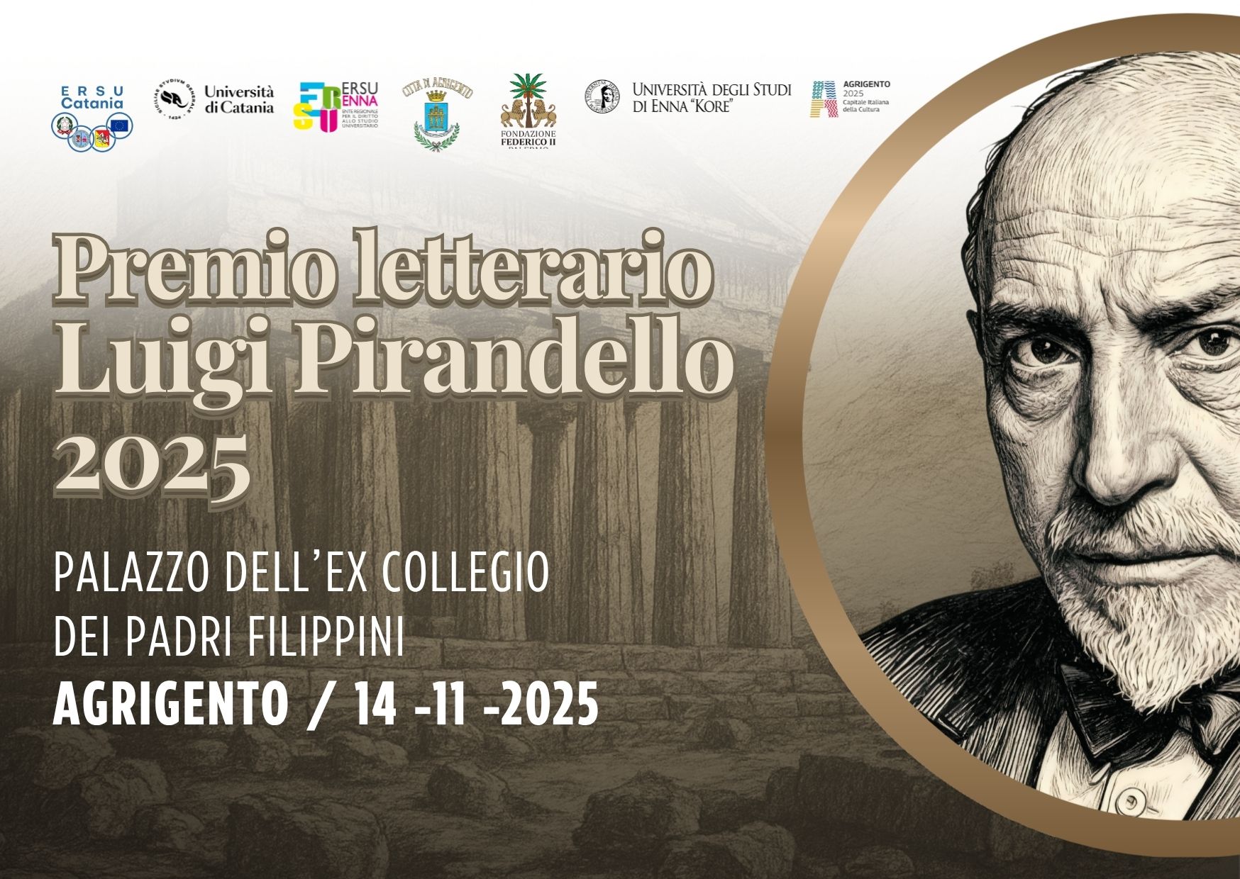 Si svolgerà venerdì 14 novembre 2025 nel suggestivo Palazzo dell’ex Collegio dei Padri Filippini la cerimonia conclusiva del Premio Letterario Luigi Pirandello 2025, promosso e organizzato dall’ERSU di Catania in collaborazione con l’Università degli Studi di Catania, l’Università Kore di Enna, l’ERSU di Enna, con il patrocinio della Città di Agrigento e della Fondazione Federico II.